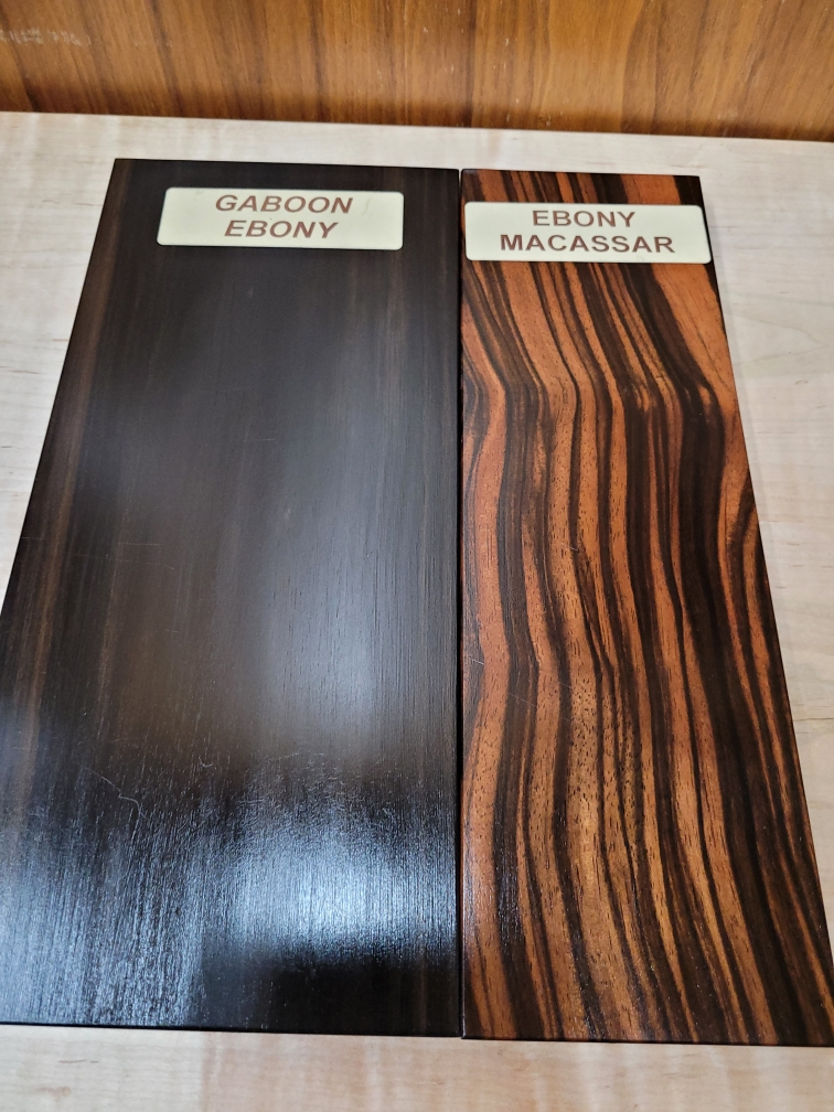 Ebony                Ebony is one of the hardest woods and is the darkest wood known, used for centuries in making musical instruments and furniture detailing.  Slow to grow, small in size, and in almost unceasing demand world-wide, the endangered African and Indonesian trees are also one of the most expensive woods available.  There are two types of Ebony, African Gabon Ebony is almost black while Indonesian Macassar Ebony is a deep reddish brown with black graining. Both have similar density and finishes texture.  Thought to repel evil spirits, Ebony was even used to make drink glasses to protect their users from being poisoned.                                                      Janka Rating – 3220