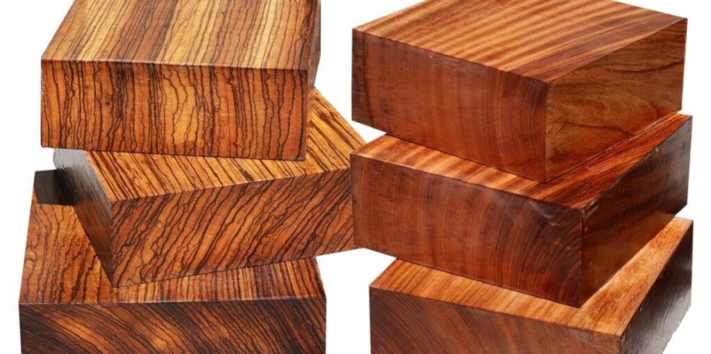 Ziricote              A smaller tree from Mexico to Central America, Ziricote has been cultivated since the Mayan Empire growing 30 to 65 feet tall.  While the outer sapwood is a pale blonde, the heart wood is a dark brown with a pecular rippled grain making it a popular choice of guitar luthiers. The trees produce an edible fruit that tastes like a blend of a Granny Smith apple and a banana.                                                                                              Janka Rating – 1970